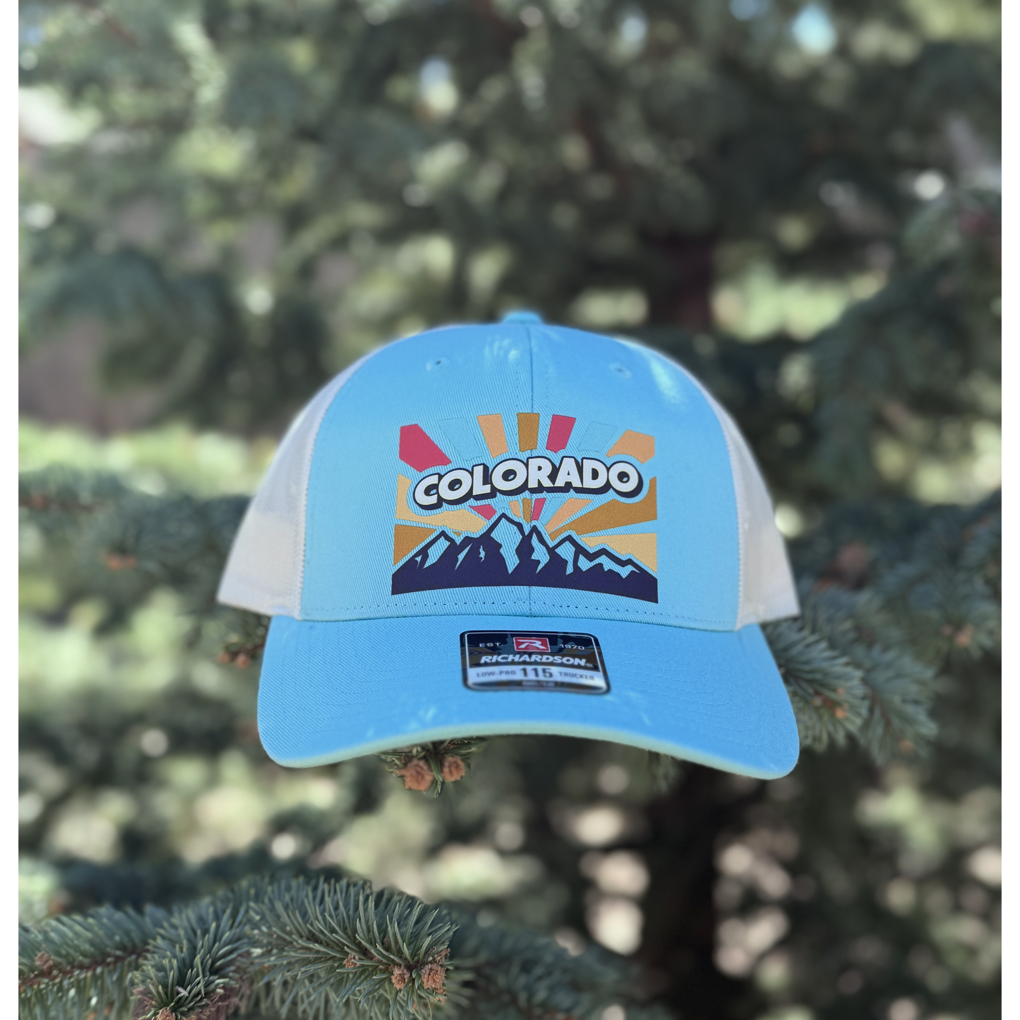 Sunrise Alpine Hat with a retro Colorado mountain design. Breathable trucker hat with adjustable fit, perfect for everyday wear in Fort Collins and beyond.