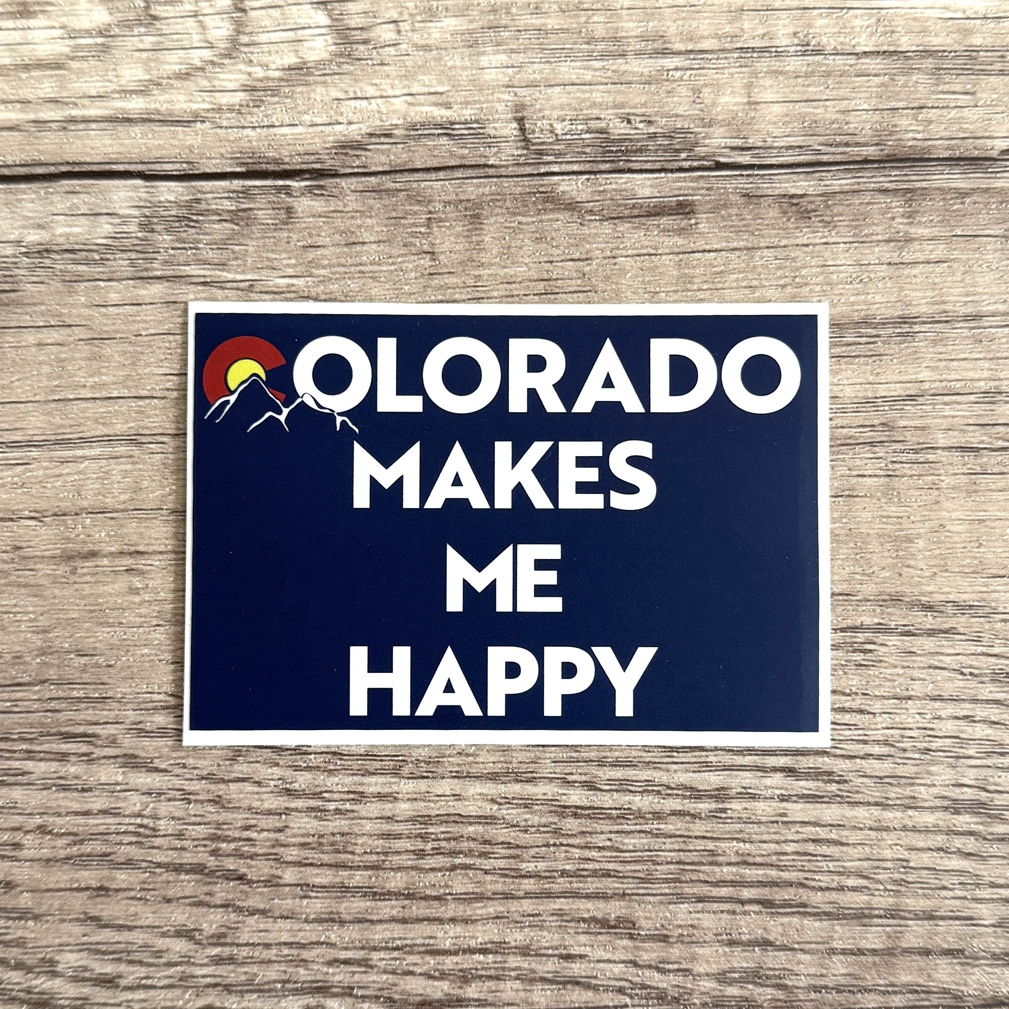 The Colorado Makes Me Happy Sticker is a vibrant celebration of Colorado pride. Featuring bold, capitalized text in navy blue, the design stands out with a clean and modern look. The iconic Colorado “C” logo—a red circle with a yellow sun—sits beside the word “COLORADO,” adding a pop of color and unmistakable state symbolism. Snow-capped mountain peaks are illustrated beneath the “C,” reinforcing Colorado’s famous Rocky Mountain landscape.