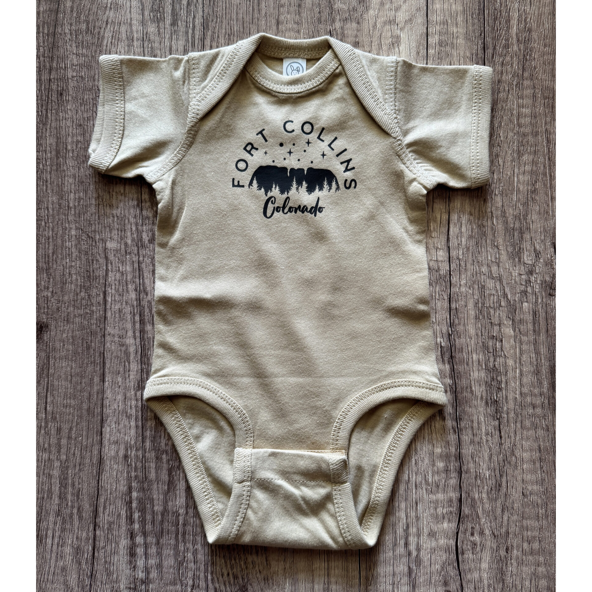 The front features a playful mountain silhouette with pine trees and stars, paired with “Fort Collins Colorado” text, so even the youngest members of the family can show off their hometown or favorite travel destination. It’s an adorable piece that captures the spirit of Northern Colorado and makes every baby picture a little more Instagram-worthy.